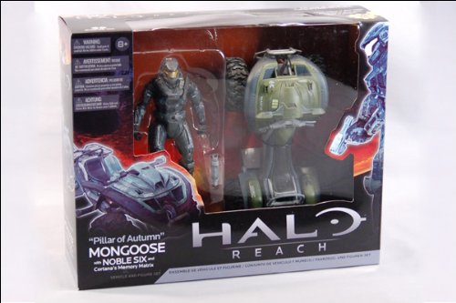 Halo Reach Action FiguresThis Mongoose vehicle set is inspired by the exciting final level of Halo Reach. In the finale, Noble Six must deliver the artificial intelligence, Cortana, safely to the cruiser Pillar of Autumn setting in motion the events that started the first Halo game, Halo Combat Evolved. In one memorable scene, Noble Six and Emile go for a wild ride aboard a Mongoose ultra light allterrain vehicle, dodging enemy gunfire, falling drop pods, and even a massive Scarab assault platform! This set includes Noble Six, a standard campaign green Mongoose vehicle, and, as a bonus accessory, the transport tube used to carry Cortanas fragile memory matrix.